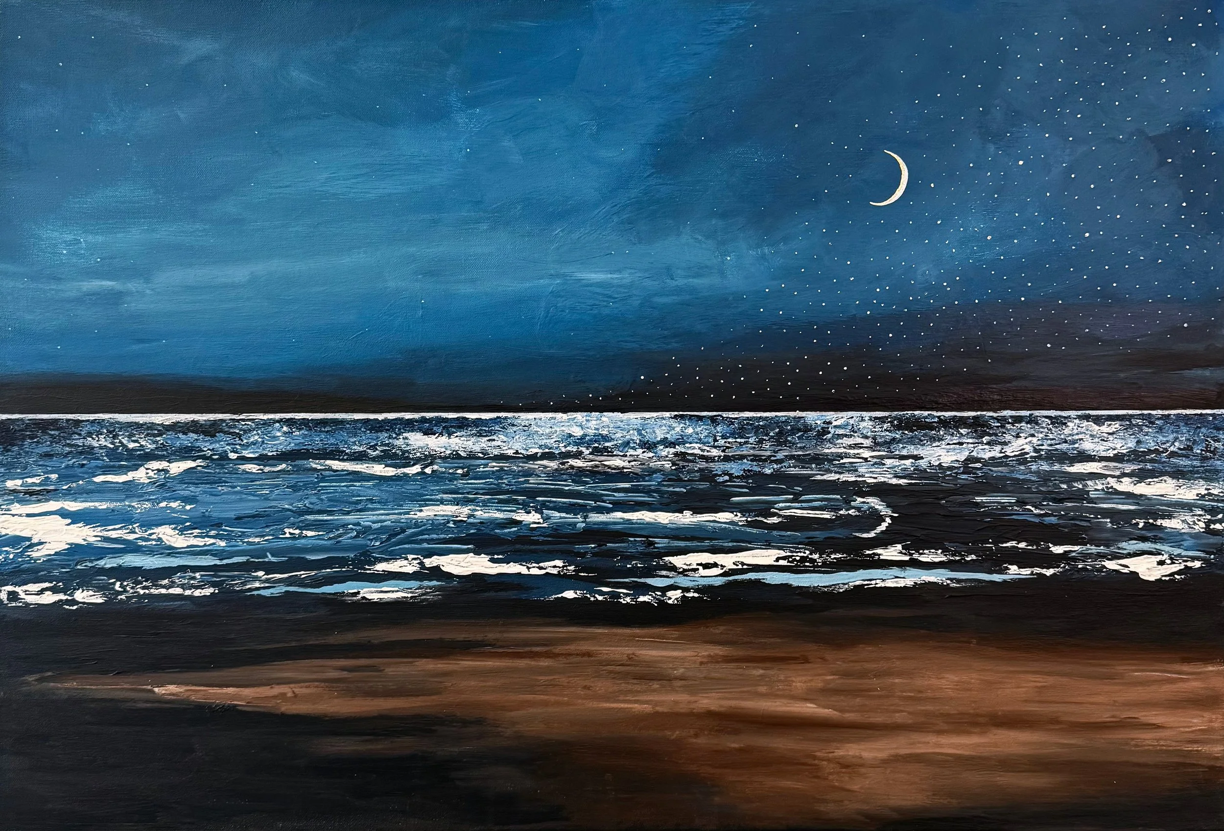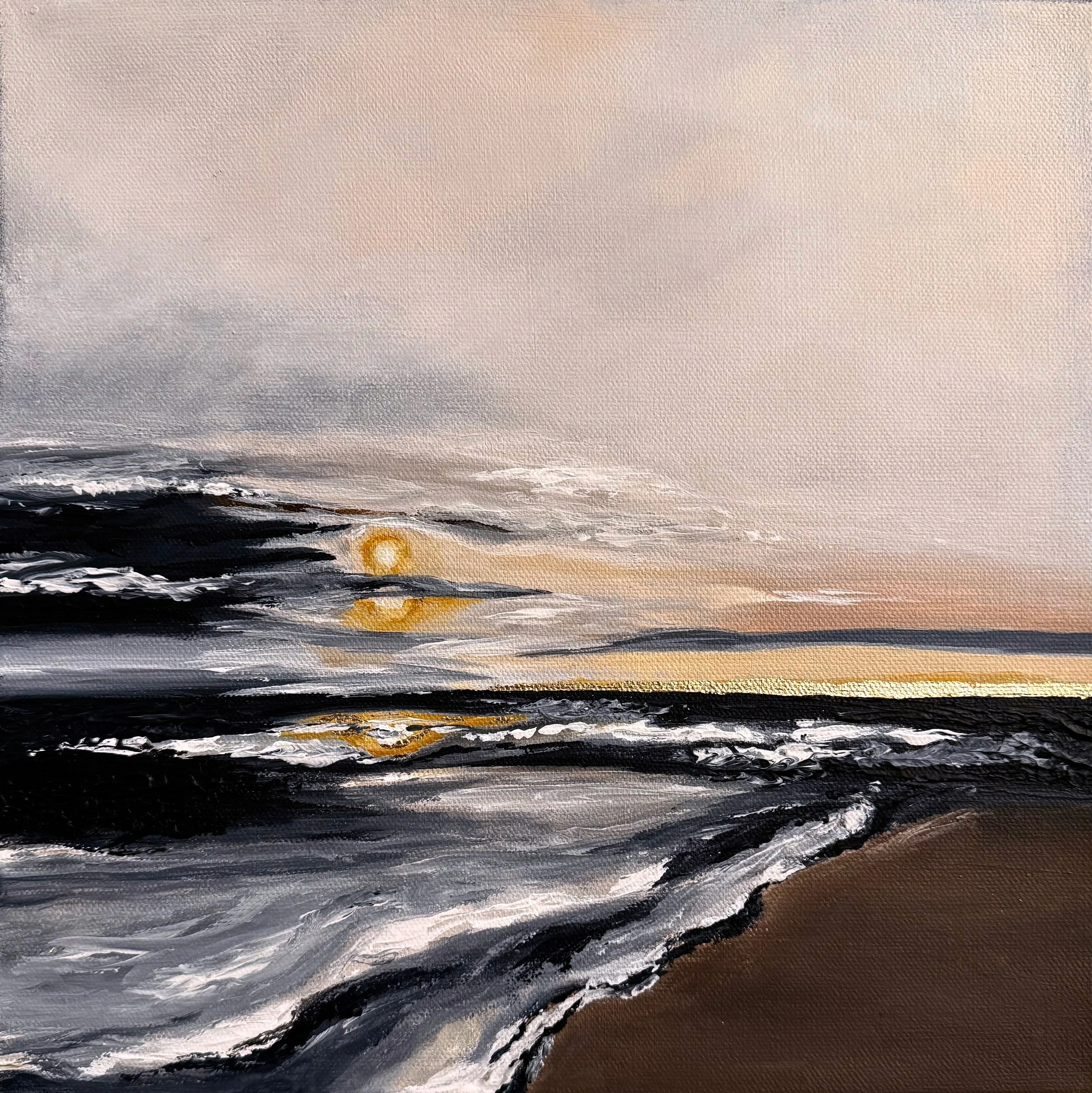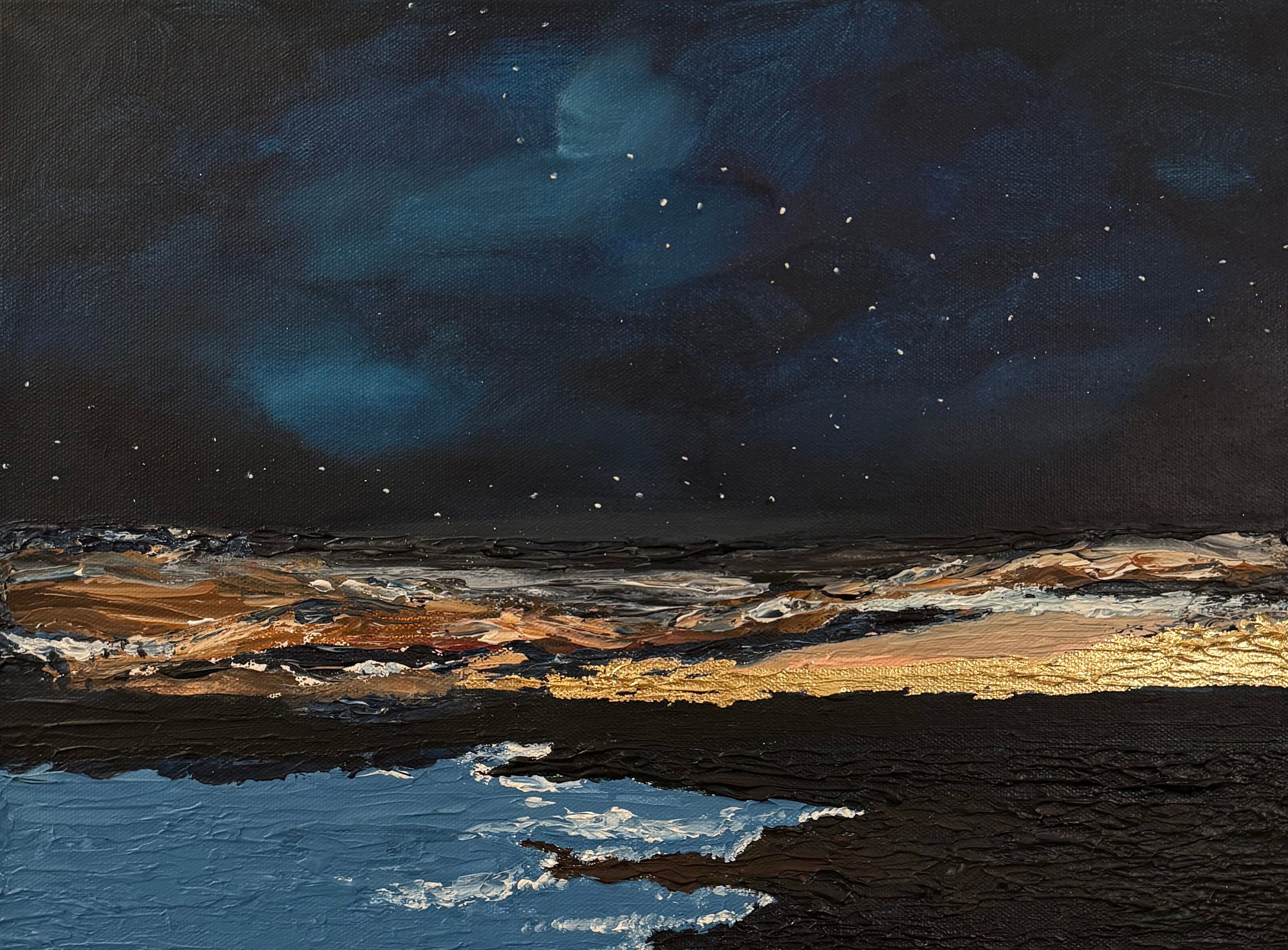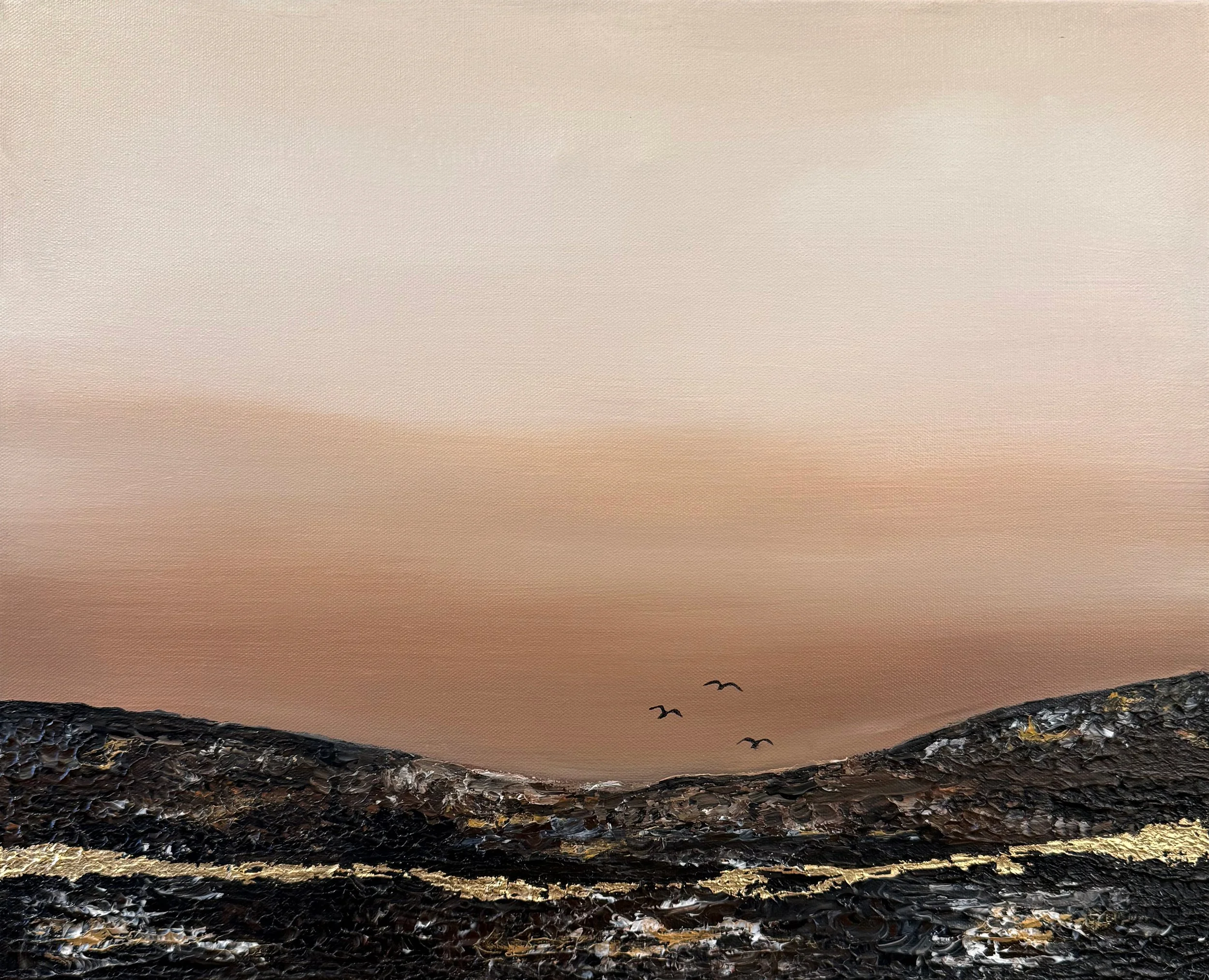 These paintings capture the space where reality dissolves and the unconscious begins to speak. Shapes blur, environments shift, and familiar forms appear slightly altered, as they often do in dreams. Gold tones, layered textures, and atmospheric color evoke sensations rather than narratives, allowing the viewer to move through the work the way one moves through a dream.
